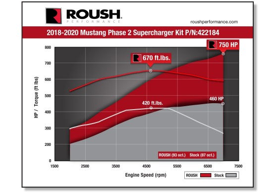 The ROUSH Phase 2 Supercharger kit builds on the enhanced performance of the Phase 1 supercharger system and boosts the stock 5.0L V8 Ford Mustang GT to an astounding 750 horsepower and 670 pound-feet of torque. The high-capacity low temperature radiator provides increased cooling capability and works with Eaton's TVS R2650 technology for greater power output. The larger LTR and upgraded calibration work in harmony to improve cooling and optimize performance, giving drivers extra laps at the track. The Phase 2 Supercharger delivers thrilling power, unparalleled performance, and versatility across both manual and automatic transmissions. The complete system is optimized for 93-octane fuel for superior performance. ROUSH ensures every 2018-2020 5.0L Mustang Phase 2 Supercharger offers peace of mind with our 3-year/36,000-mile ROUSH limited powertrain warranty. 50-State emissions-legal on 2018-2020 Mustangs (CARB E.O. #D-418-34).